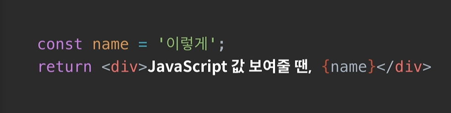 다음과 같이 자바스크립트 값을 JSX 내부에서 사용하려면 {name}과 같이 중괄호로 감싸주어야 한다.