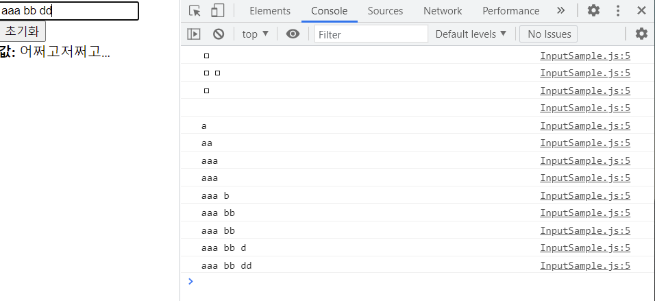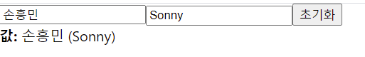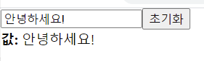 다음과 같이 입력한 것이 '값:'에 표시되고 초기화를 누르면 입력창이 비워지는 예제를 통해 알아보자.