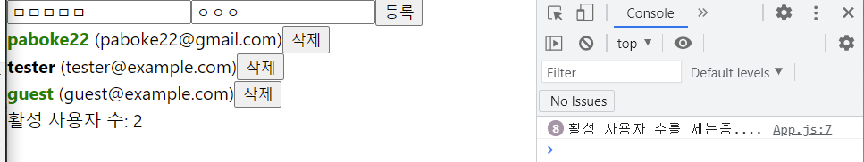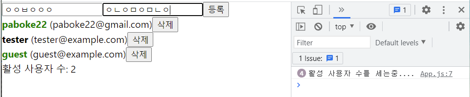 다음과 같이 input을 바꾼다 해도 활성 사용자 수를 세는 함수가 호출되지 않는 것을 확인할 수 있다.