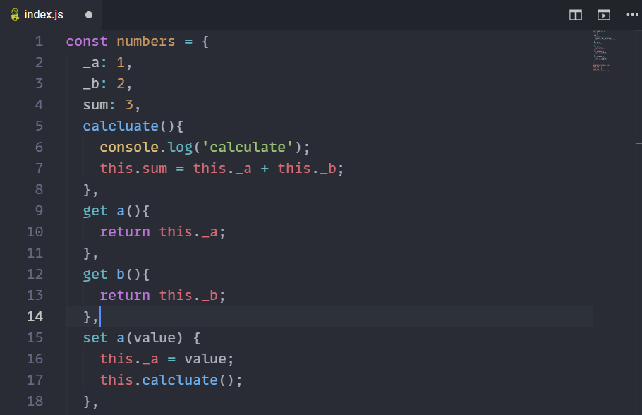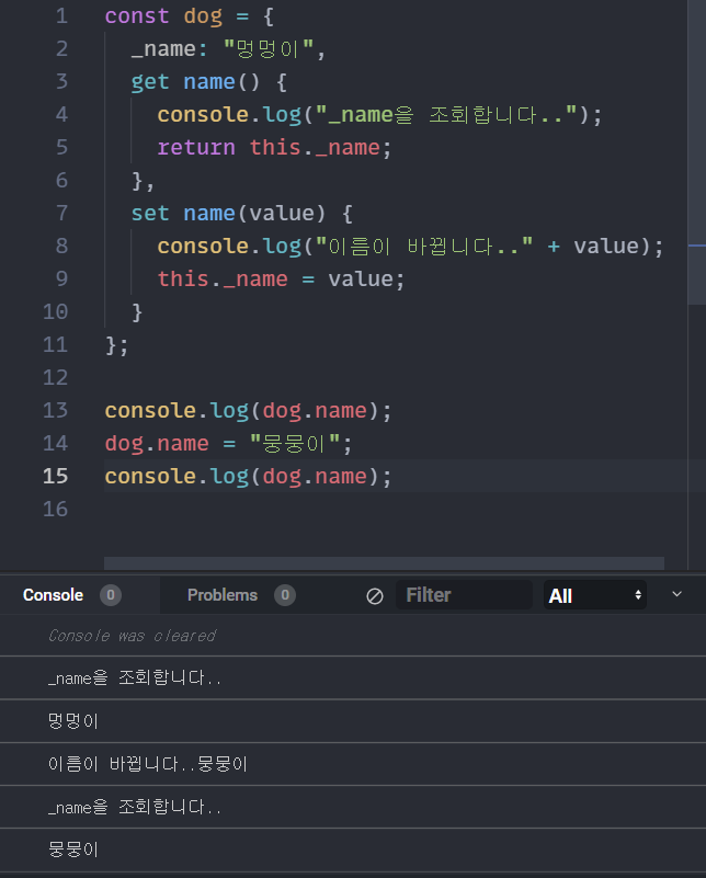 Getter 함수는 함수 앞에 get이라는 키워드를, Setter 함수는 함수 앞에 set이라는 키워드를 붙여 선언한다.