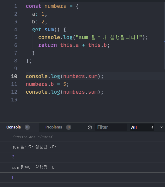 Getter 함수는 특정 값을 조회하려고 할 때 사용한다. get 함수 안의 특정 코드를 실행하고 연산된 값을 받아 리턴을 하는 형식이다. Getter 함수는 리턴이 반드시 있어야 한다.